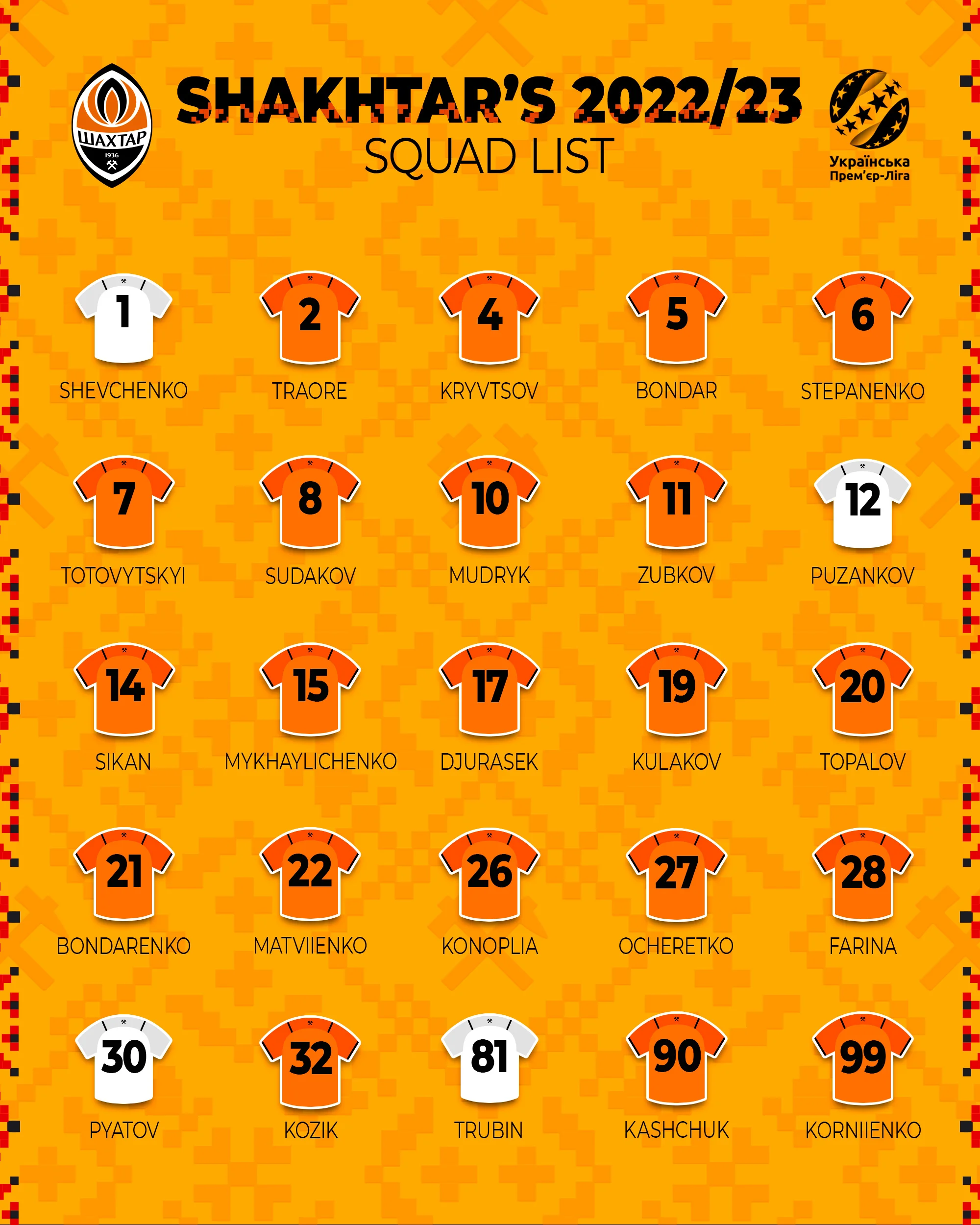 Цікавим став вибір номерів гравцями. Зокрема, Андрій Тотовицький взяв собі "сімку", Михайло Мудрик обрав елітну "десятку", а Олександр Зубков виступатиме з цифрою 11 на спині. Раніше екс-гравець Ференцвароша навіть обіцяв спитати дозволу у легенди Шахтаря Марлоса, аби заволодіти заповітним номер. Несподіваним також став вибір від Лассіни Траоре – буркінієць вирішив виступати у футболці № 2.