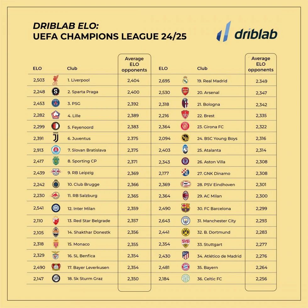 Статистичний портал Driblab склав рейтинг 36 команд-учасниць цього розіграшу Ліги чемпіонів. Враховувалися голи, очікувані голи, потенційна загроза для суперників, ринкова вартість клубів, перевага домашнього поля тощо. Кожен клуб отримав ELO – умовний показник сили.