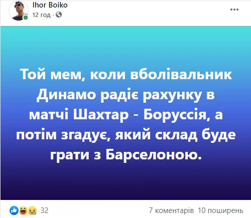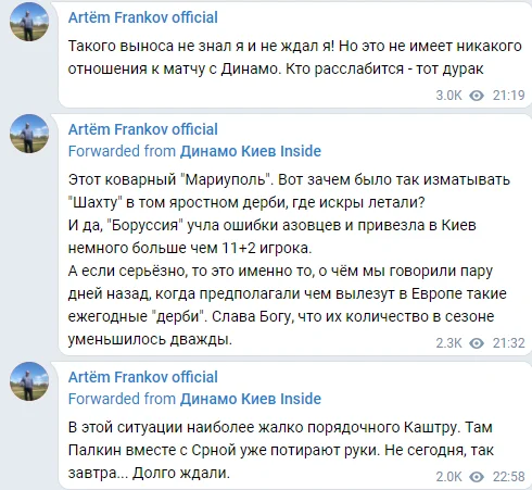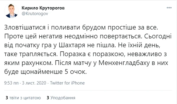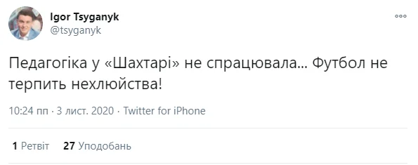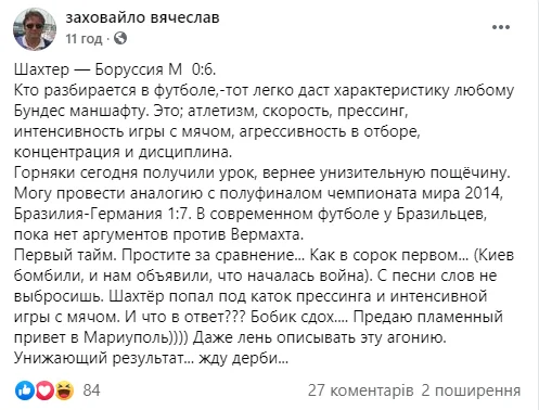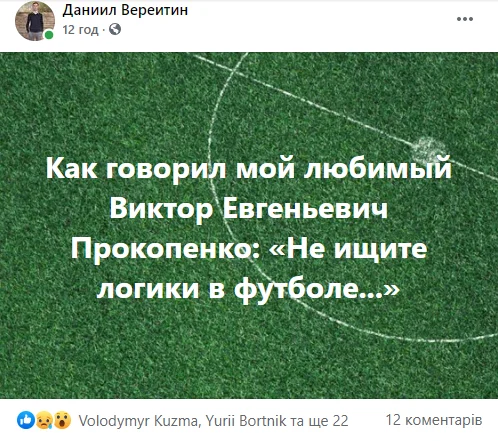 Були й більш спокійні та розсудливі репліки. Данило Вереітін, журналіст і PR-фахівець телеканалів "Футбол", пригадав крилатий вислів легендарного наставника Шахтаря.