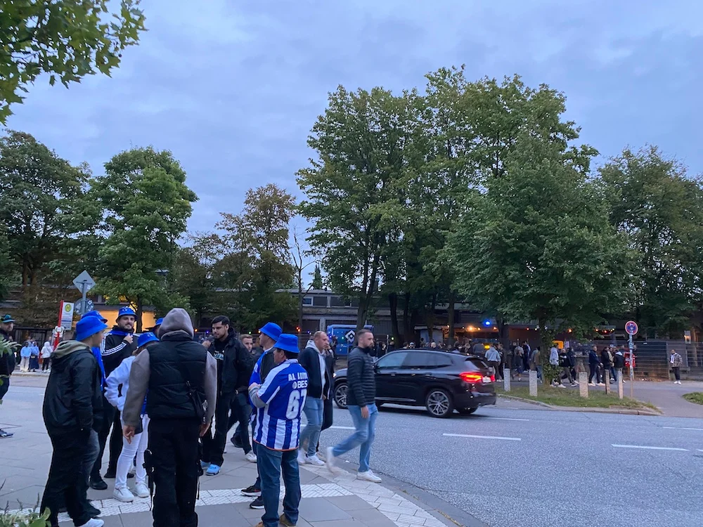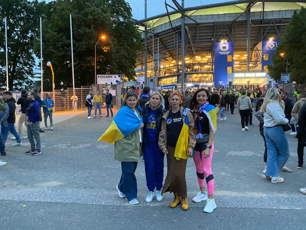 Із символікою Шахтаря рідко можна було зустріти якогось уболівальника, проте українські прапори майоріли за кілометр. Зокрема, вдалося поспілкуватися з тими, хто активно розповідає німцям про жорстокі події в Україні. Жінки представляють благодійний фонд VILNI DE.UA та проводять різні акції у Гамбурзі чотири рази на тиждень – мітинги, перфоманси та івенти. За їхніми словами, вони після кожного заходу зібрані донати відправляють ЗСУ.
