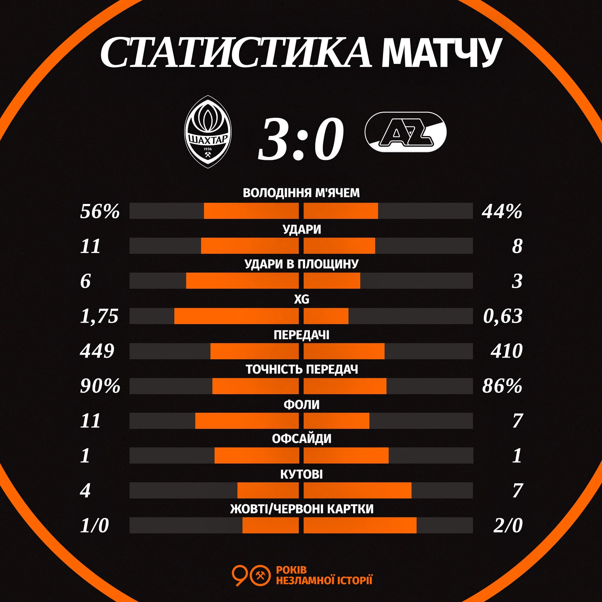 Так, післяматчева статистика говорить про те, що xG (кількість очікуваних голів) Шахтаря становив 1,75 голи. Тобто, "гірники" створили моментів не більше, ніж на 2 голи. При цьому, xG АЗ Алкмар склав 0,63 – нідерландці були близькими хоча б до 1 голу у ворота Дмитра Різника.