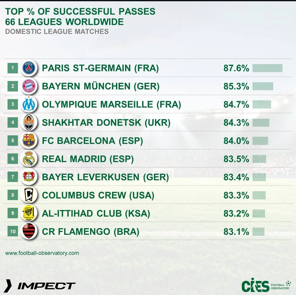 CIES Football Observatory опублікувала рейтинг команд з найбільшим відсотком точності передач. Під час дослідження були взяті до уваги 66 ліг світу.
