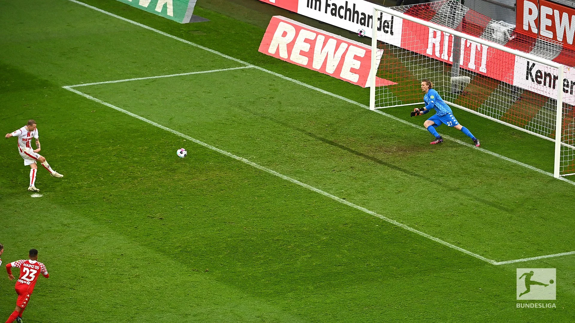 Програму дня закривав матч між аутсайдерами – Кельн приймав Майнц. Обидві команди в разі перемоги покинули б зону вильоту, а конкретно гостям було достатньо і нічиєї. Саме вони і відкрили рахунок на 11-й хвилині зусиллями Боетіюса, якому вдався шикарний удар з-за меж штрафного. М'яч рикошетом від поперечки влетів у ворота – 0:1! Втім, перед свистком на перерву "цапи" відновили статус-кво завдяки пенальті, який реалізував Дуда. 1:1.