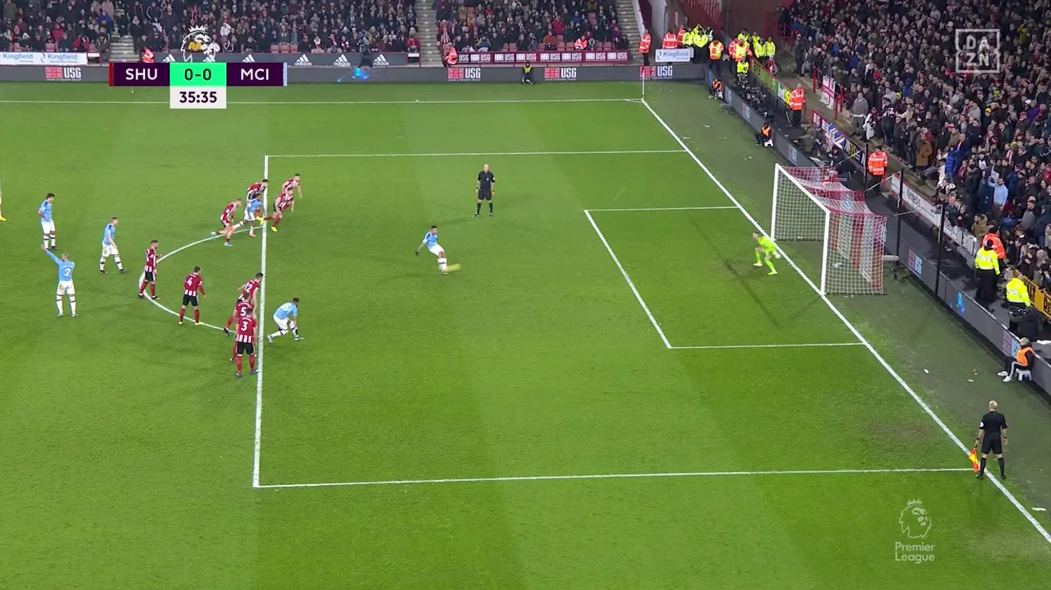 На 19-й хвилині Сіті втратив вбивчий момент. Стерлінг у центрі поля відібрав м'яч, обігрався з Марезом та пробив метрів з 10-ти – Хендерсон класним сейвом врятував Шеффілд! Зінченко класно вступив у боротьбу в чужому штрафному та заробив кутовий. Було чітко помітно, що м'яч вийшов від гравця господарів, але арбітр Лі Мейсон вважав інакше – удар від воріт. Після навісу Зінченка у штрафний "клинків" Фернандінью скинув у центр на Отаменді, той ефектно пробив у падінні – знову Хендерсон! Міг бути шедевр, якби не голкіпер Шеффілд Юнайтед. Наступна атака Сіті завершилася невдалим пострілом Стерлінга – значно вище воріт. Команда Гвардіоли у перші півгодини більше володіла м'ячем (38 на 62%), завдала 4 удари проти 0 у суперника, але забити не змогла.