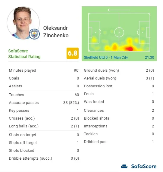 Загалом було помітно, що Зінченко перебуває не в оптимальній формі – на відміну від Менді зразка минулих матчів, дійсно гострих передач у виконанні Олександра не було. Проте Олександр грає в дещо іншому стилі (це раніше відзначав і Гвардіола), тому в цілому поєдинок проти Шеффілд Юнайтед українець, в принципі, провів на своєму рівні. Нічого особливого в атаці, проте відносно надійно у захисті та центрі поля. Щоправда, без особливого креативу, який необхідний у подібних матчах з командами, що грають другим номером.