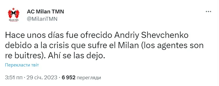 Агенти запропонували керівництву "россонері" запросити на тренерський місток Андрія Шевченка. Про це інформує Twitter-акаунт AC Milan TMN, який детально висвітлює новини клубу.