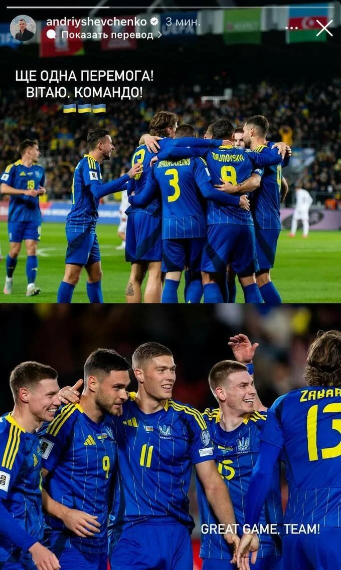 Президент УАФ Андрій Шевченко поділився емоціями після перемоги збірної України над Азербайджаном (2:1) у матчі відбору до чемпіонату світу 2026 року.