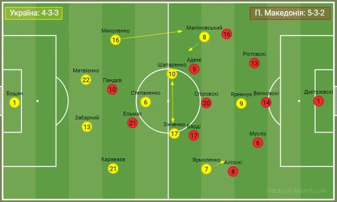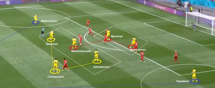 Після вдалого розіграшу та просування м'яча у другу третину поля Миколенко підіймався по флангу вище. Часто до захисників на фланг опускався Зінченко. Маліновський зміщувався у півпростір та відходив до вільної зони лівого інсайда (Зінченко).