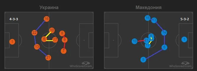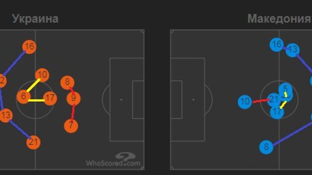 На відміну від попередніх матчів, обидві команди у своїх атакувальних діях мали горизонтальну збалансованість. Діаграма передач збірної Украиїни дозволяє звернути увагу на ефективність Шапаренка, який має другий результат за кількостю пасів. У нього лише на сім дій менше ніж у Матвієнка, але більший відсоток точних передач, які до того ж були гострішими і спрямованими на просунення м'яча. Між цими гравцями була найкраща взаємодія на полі, принаймні математична.