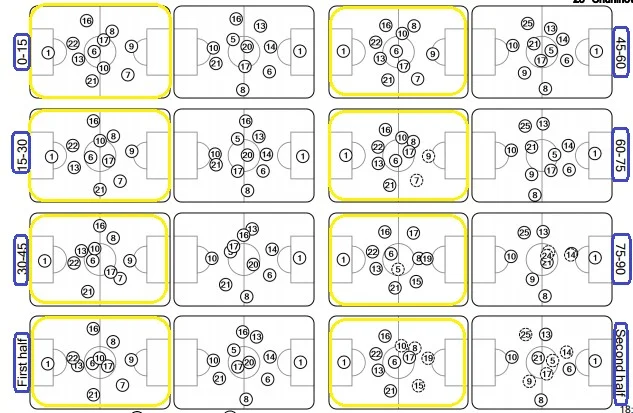 Ігрова структура збірної України була досить гнучкою та асиметричною у різних фазах. Розглянемо зміщення та позиції гравців у початковій стадії розвитку позиційної атаки.