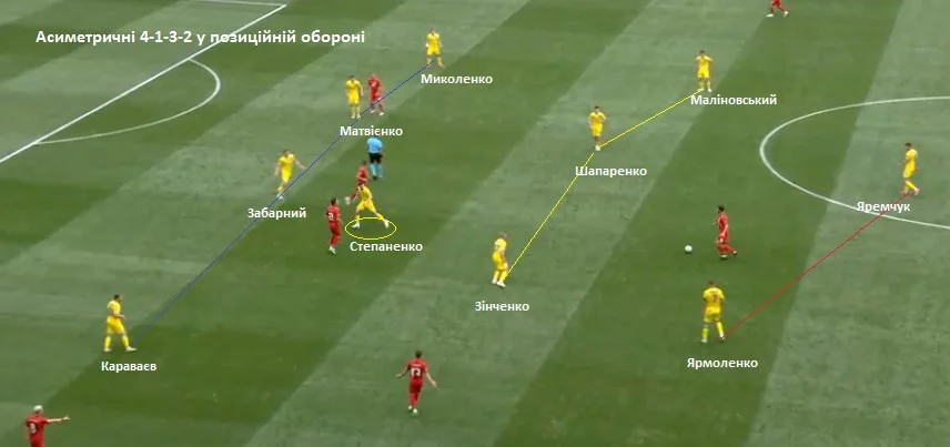 Поступово структура перетворювалася на фазову схему з умовним ромбом у центрі поля. Гравці часто змінювали позиції, але при цьому структура залишалася однаковою. Якщо, наприклад, Ярмоленко зміщувався на фланг, Караваєв йшов у півпростір, і так далі. Постійно місцями мінялися Маліновський, Зінченко та Шапаренко. Чисельна перевага у зоні м`яча та зони взаємодій створювала гарні умови для ефективного контрпресингу. Цей аспект у виконанні нашої команди до перерви працював дуже пристойно. Як завжди, ефективно без м'яча (з м'ячем також) діяв Яремчук. Знову маємо відзначити його взаємодію з Ярмоленком. Поки ця зв'язка – найкраща у нашої команди.