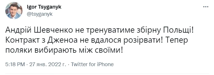 "Андрій Шевченко не тренуватиме збірну Польщі! Контракт з Дженоа не вдалося розірвати! Тепер поляки вибирають між своїми!" – написав Циганик у Twitter.