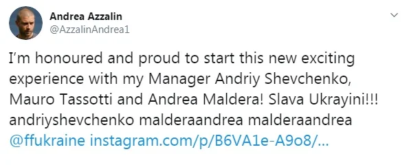Андреа Адзалін пройшов шлях від скромного та спокійного Варезе до вершини Прем'єр-ліги. Новоспечений асистент Андрія Шевченка став одним із творців чи не найбільшої футбольної сенсації останніх років, а тепер його чекає новий виклик у збірній Україні. Перший крок до успіху 34-річний італієць вже зробив. "Я гордий розпочати новий досвід з моїми тренерами Андрієм Шевченком, Мауро Тассотті та Андреа Малдерою. Слава Україні", – написав написав італієць у Twitter.