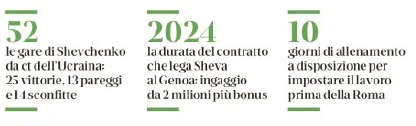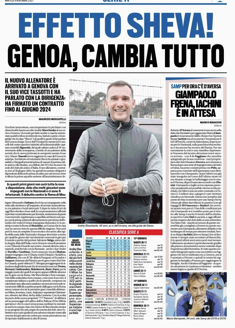 Тассотті прибув на базу першим, ще в неділю. Після трьох днів відпочинку команда повертається до роботи у вівторок, 9 листопада. Шевченко вже показав прекрасний результат не лише як футболіст (чвертьфінал Євро-2020 з Україною), переконані у генуезькому клубі. Хоч це й іноземець, молодий тренер, але без мовного бар'єру і з цікавим міжнародним досвідом. Tuttosport кричить на перших шпальтах, що ефект Шеви змінює все відразу після приходу. Усміхнений ентузіаст закликає повернути велич 9-разовому чемпіонові Італії, багато тіфозі охоче вірять у казку. Посилання на історію не голослівне – лише Ювентус, Інтер і Мілан частіше брали Скудетто. Але воно і дуже зобов'язує.