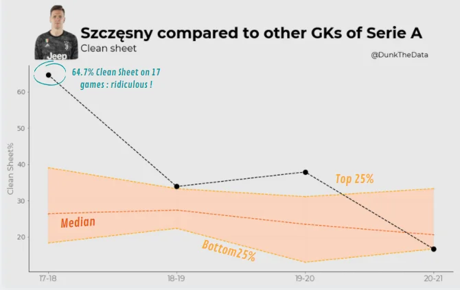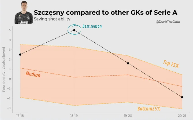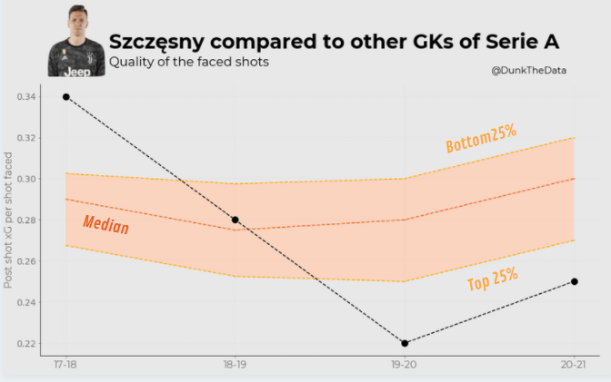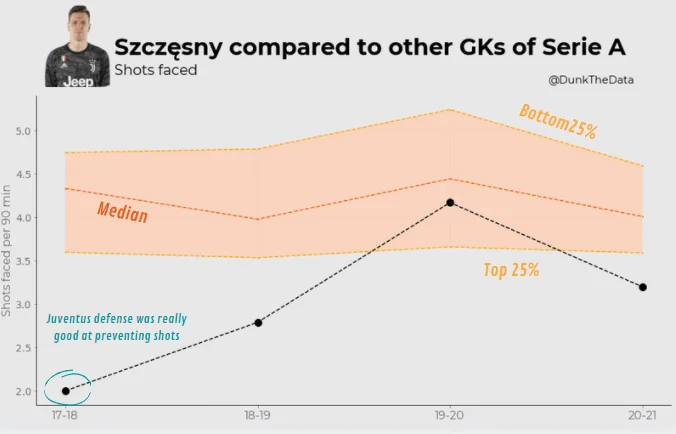 У сезоні-2017/18 Войцеху доводилося парирувати значно складніші удари. Тобто Ювентус в останні роки допускає більше ударів по своїх воротах, але ці удари не такі гострі. Класний голкіпер мав би покращити свою статистику.