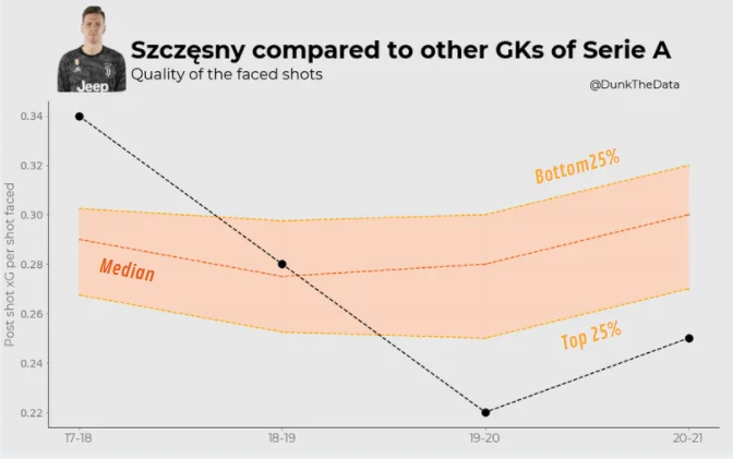 Щенсни, звичайно, не настільки поганий воротар, як може здатися з цих матчів. Але статистика показує регрес поляка. DunkTheData проаналізували показники Войцеха з моменту його приходу в Ювентус.