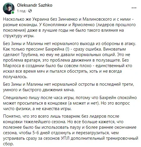 Команда Шевченка вчетверте поспіль зводить поєдинок до нічиєї 1:1. Неприємна тенденція продовжується за кілька тижнів до старту головного континентального форуму. Та ще й за підтримки 20 тисяч уболівальників на харківському ОСК Металіст. Словом, перед Євро-2020 не покидає відчуття тривоги. Відсутність двох ключових виконавців – Зінченка і Маліновського – не виправдовує сірий футбол з потенційно слабшим суперником, принаймні на папері. Дежавю. Ми знову створили чимало моментів, але поплатилися за нікудишню реалізацію та неуважну гру біля власних воріт. Фінляндія, Казахстан, Бахрейн... З цим потрібно щось робити.