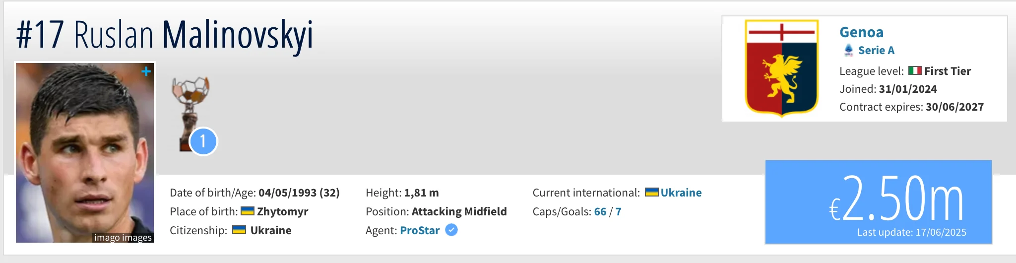 Півзахисник Дженоа Руслан Маліновський залишився з попереднім цінником – 2,5 мільйона євро.
