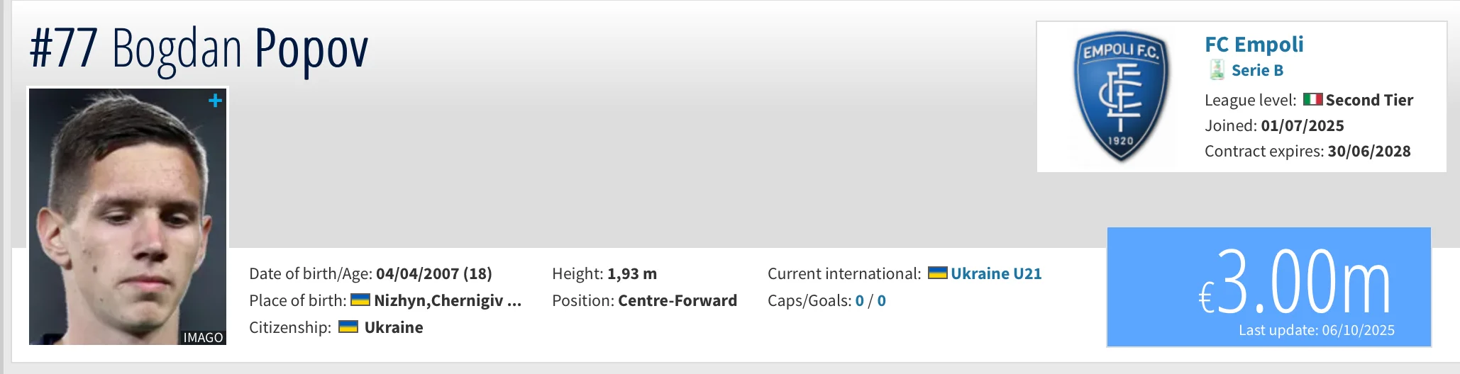 Натомість 18-річний форвард Емполі Богдан Попов значно додав у ціні – його ринкова вартість зросла у п’ять разів і тепер складає 3 мільйони євро.
