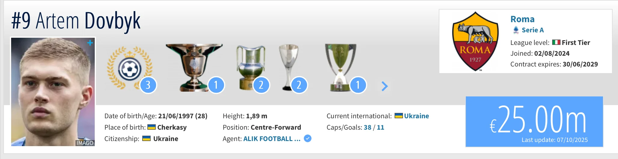 Форвард Роми Артем Довбик нині оцінюється у 25 мільйонів євро, що на 5 мільйонів менше, ніж раніше, коли 28-річний нападник коштував 30 мільйонів.