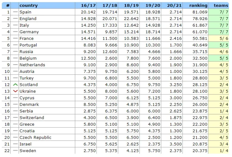 Відставання від Туреччини збільшилося з 0,3 до 0,7 очок. Розрив від Австрії перевищив 2 очки. Зауважимо, що ця таблиця формує представництво країн на єврокубковий сезон 2022/2023 і нам потрібно боротись за 10-те місце, яке дозволяє заявити свого представника до групового раунду Ліги чемпіонів напряму (11-та позиція зможе це зробити лише за певних обставин).