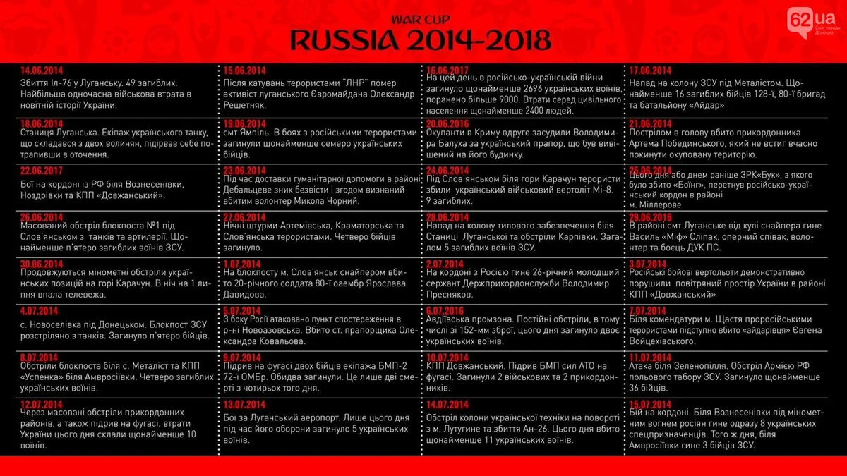 В сети появилась иллюстрация, которая показывает годовщину убийств, совершенных оккупантами на Востоке Украины. На каждый день чемпионата мира – новые жертвы.