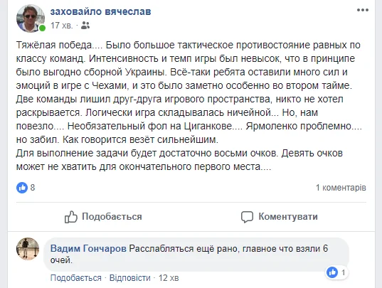 Агент Вячеслав Заховайло заметил, что 8 очков (то есть двух ничьих во втором круге) сборной Украины точно хватит для первого места, а 9 может быть недостаточно, если кто-то из дуэта Чехия/Словакия наберет столько же и у него будут лучше дополнительные показатели.