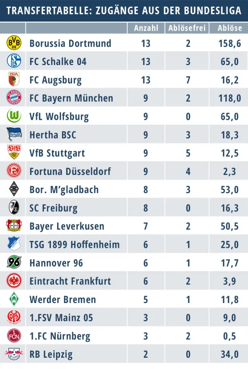 Боруссия Д, Шальке и Аугсбург пригласили больше всего игроков из других клубов Бундеслиги на данный момент.
