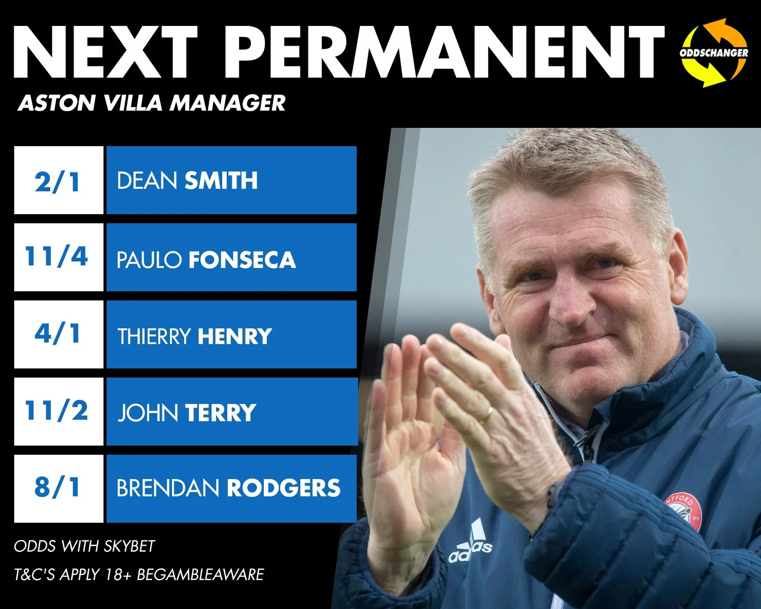 Букмекеры прогнозируют, что самые большие шансы возглавить Астон Виллу имеет коуч Брентфорда Дин Смит. Его назначение оценивается от 5 до 3. Вторым фаворитом называют наставника Шахтера Паулу Фонсеку. За последние 15 часов коэффициент на его назначение уменьшился с 19 до 5 и даже до 3,75 в некоторых конторах. Также среди претендентов фигурируют имена Джона Терри (от 9 до 6,5), Брендана Роджерса (от 13 до 9) Карлоса Карвальяла (13) и Сэма Аллардайса (от 20 до 9).