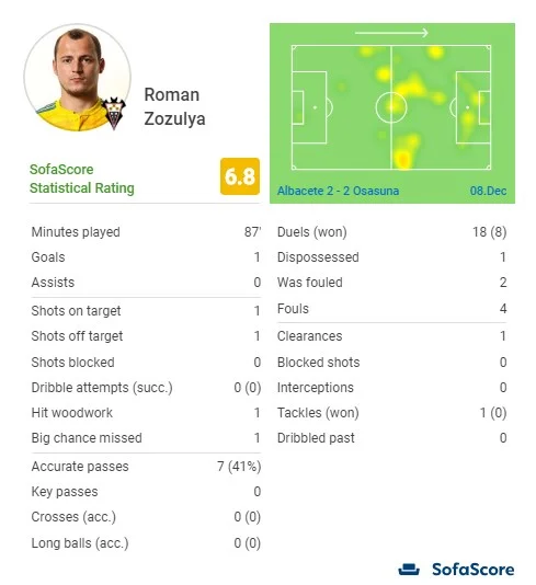 Среди другой статистики 29-летнего нападающего нужно обратить внимание на общее количество единоборств (18) и количество успешных (8). В этом компоненте Зозуля вчера был лучше, чем в среднем по сезону – 13.2 в целом и 5.8 успешных. Оценка от статистического портала SofaScore – 6.8. Бал ощутимо снизила красная карточка в конце встречи.