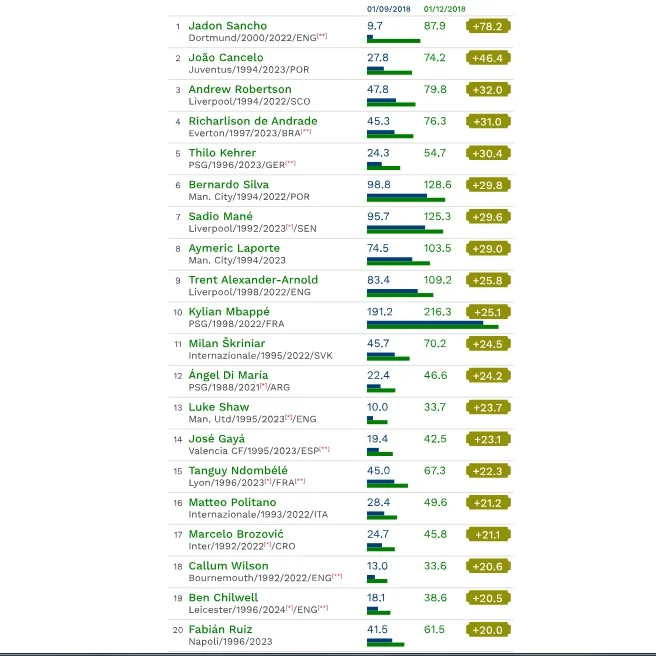 Абсолютный топ рейтинга. Английский вундеркинд Боруссии подорожал на 800% (!!!) и стоит почти 88 млн, хотя еще 3 месяца назад оценивался даже не в 10. 18-летний Санчо уже установил несколько рекордов и стал настоящим лидером дортмундцев. Возможно, подъем "шмелей" связан именно с феерической игрой Санчо?