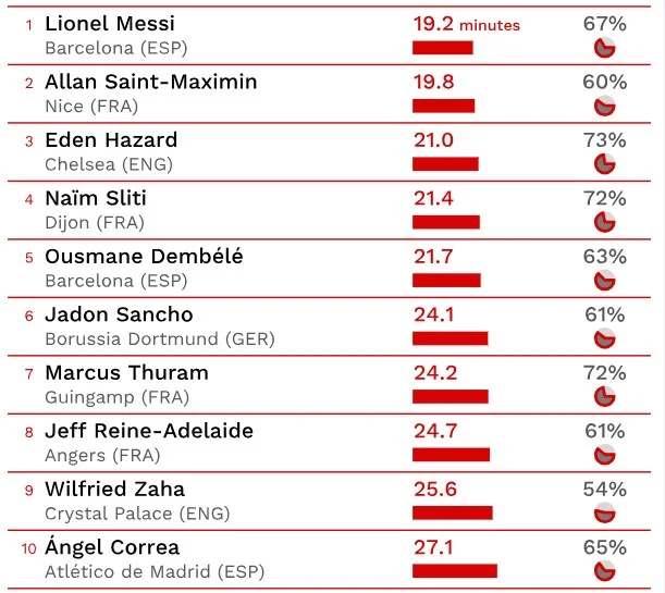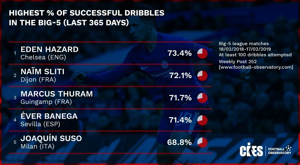 Football Observatory проанализировала дриблинг всех футболистов в топ-5 европейских лигах за последние 365 дней. На основе данных Opta составлен рейтинг игроков, которые чаще всего успешно идут в дриблинг. Учитывались только те исполнители, которые с 18 февраля 2018-го по 17 февраля 2019-го провели на поле не менее 1800 минут во внутреннем чемпионате (для Бундеслиги – не менее 1500 минут).