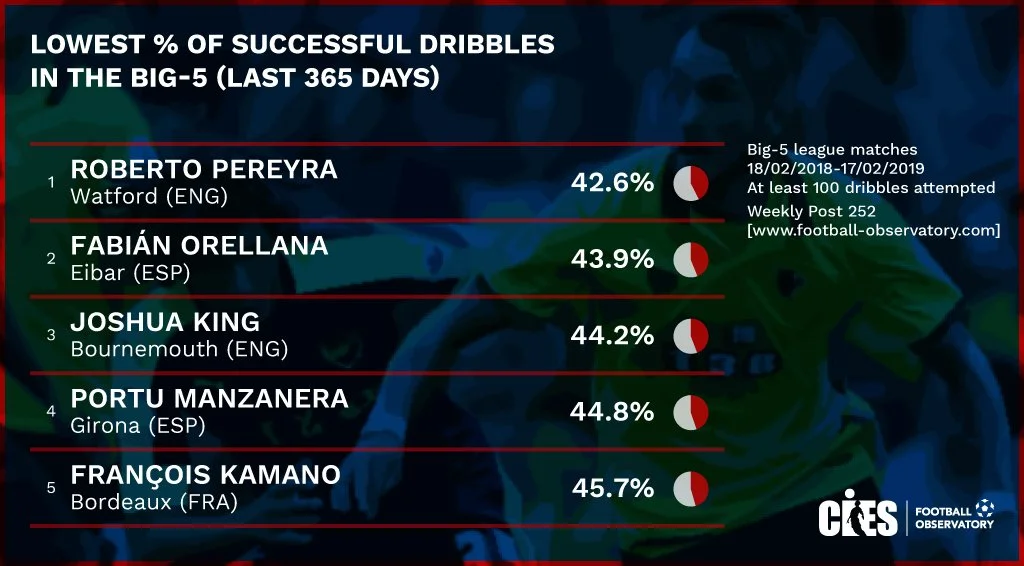 В соответствующем антирейтинге лидирует форвард Уотфорда Роберто Перейра, у которого только 42.6% попыток дриблинга завершаются успешно. Среди главных неудачников также Фабиан Орельяна из Эйбара (43.9%) и Джошуа Кинг из Борнмута (44.2%).