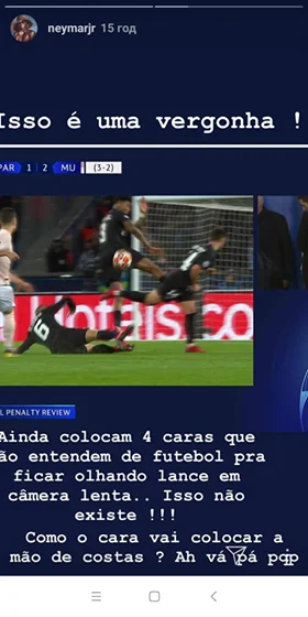 Увидев, что Скомина назначил пенальти в ворота ПСЖ, Неймар не выдержал. Бразилец написал гневный пост в Instagram.