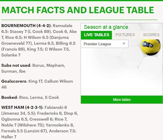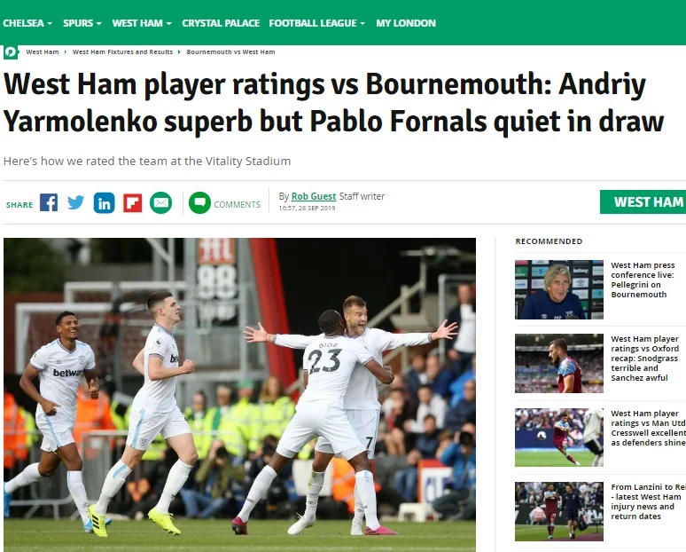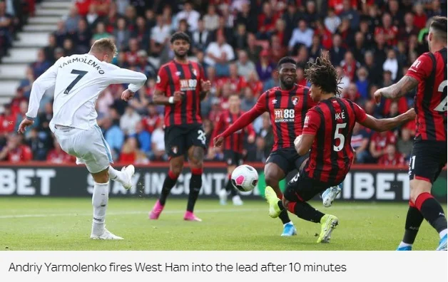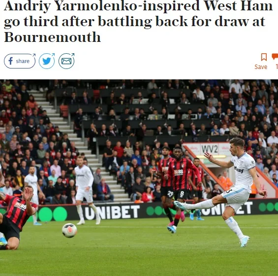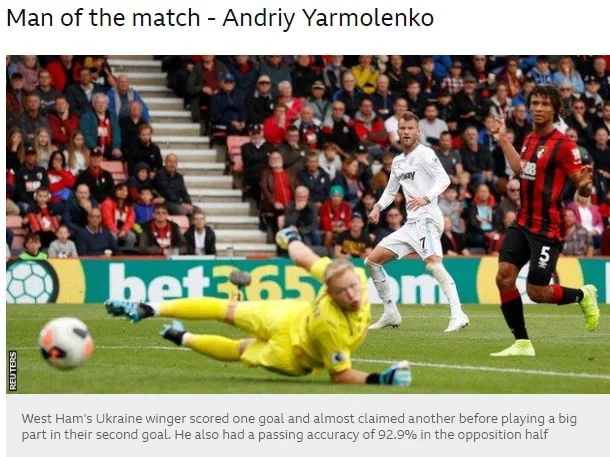 "Команда Пеллегріні, яка надихається чудовою грою Ярмоленка, продовжила свою безпрограшну серією до шести матчів, зумівши організувати камбек у Борнмуті. Український вінгер відзначився у другому турі поспіль. Він повторив свій коронний удар лівою ногою, який у попередньому поєдинку Вест Хема проти Манчестер Юнайтед змусив капітулювати Давіда Де Хеа.