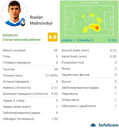 Украинский полузащитник получил шанс от Гасперини на 57-й минуте, но сделал больше, чем его конкурент. 93% точности передач, 5 удачных кроссов с 5-ти, один перехват, столько же отборов и обыгрышей. Именно Малиновский заставил схватиться за сердце не одного украинского болельщика, напугав Пятова фирменным дальним выстрелом с левой. Мяч просвистел рядом со штангой. С выходом Руслана средняя линия Аталанты выглядела значительно острее, он не боялся рисковать и брать на себя ответственность. Аналитический портал SofaScore оценил действия нашего хавбека на 6.6 балла – это больше, чем в Пашалича, с которым Малиновский борется за место в старте.