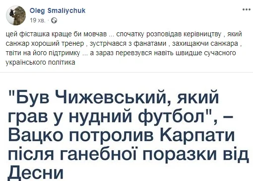 Бывший вице-президент Карпат Олег Смалийчук не остался в стороне от иронического комментария Виктора Вацко в адрес "зелено-белых".