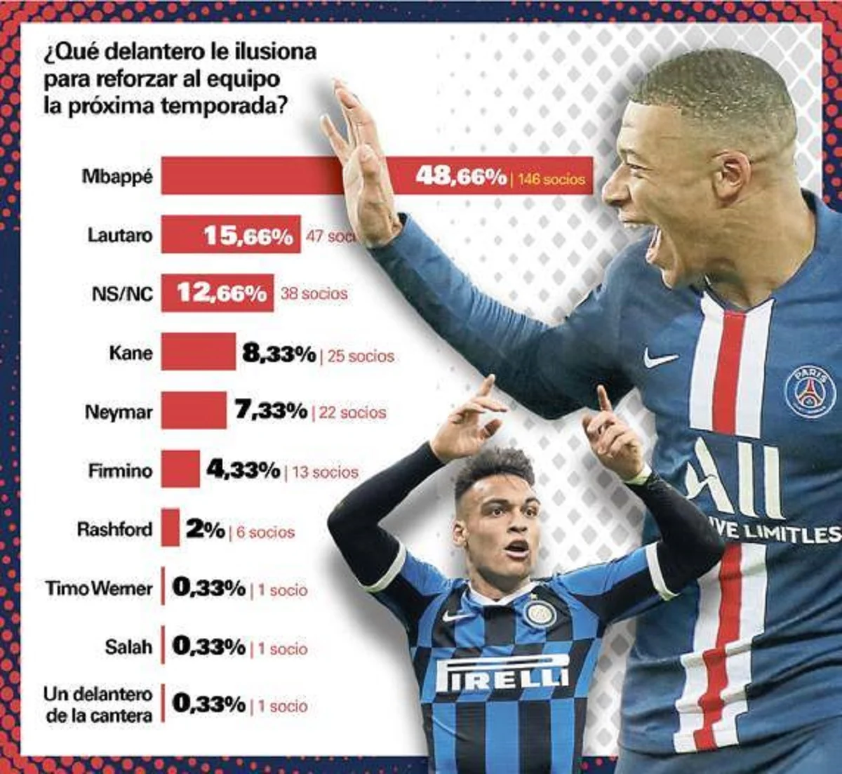 За талантливого 21-летнего форварда проголосовало 48,66% фанатов, в то время как представитель второй ступени – нападающий миланского Интера Лаутаро Мартинес – набрал лишь 15,66% голосов. Четвертым в так называемом "рейтинге" стал игрок лондонского Тоттенхэма Харри Кейн (8,33%). Интересно, что еще один представитель ПСЖ, бразилец Неймар, который в свое время уже защищал цвета "сине-гранатовых", оказался лишь на пятом месте (7,33%). 12,66% болельщиков так и не смогли определиться с приоритетным для себя вариантом.