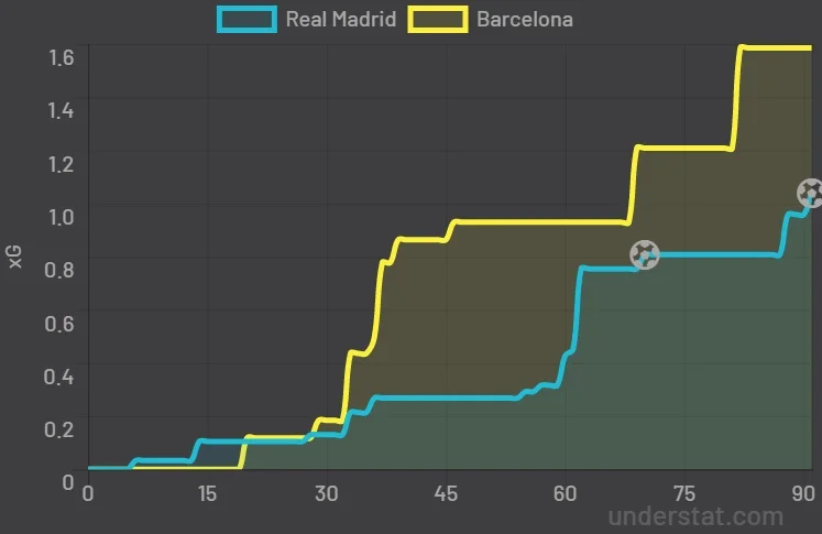 У Барселоны был фантастический отрезок в последней трети первого тайма, когда команда вполне могла выиграть поединок. Два выстрела Месси в створ из пределов штрафной, выход Артура один на один с Куртуа, заблокированный в последний момент удар Видаля с линии штрафной – Реал наглотался достаточно атак для того, чтобы получить один-два гола и уйти на перерыв без шансов на камбэк. График роста xG ярко демонстрирует, в какой момент "блаугранас" имели наибольшее преимущество.