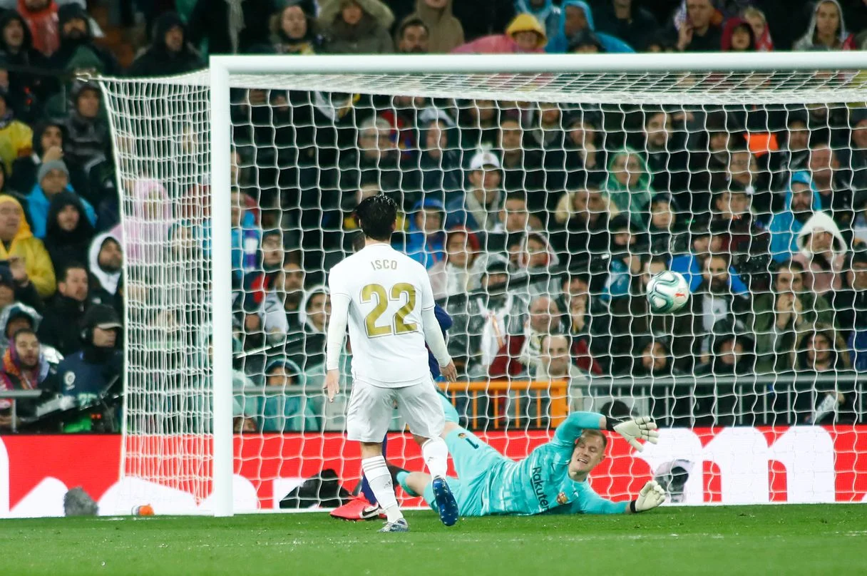 Если первый тайм по уровню остроты точно остался за Барселоной, то на старте второго хозяева вылили целый ливень моментов. Первый из них случился на 56-й минуте, когда Иско метров с 20-ти закрутил мяч в правую девятку – тер Штеген в фантастическом прыжке достал его из-под перекладины.