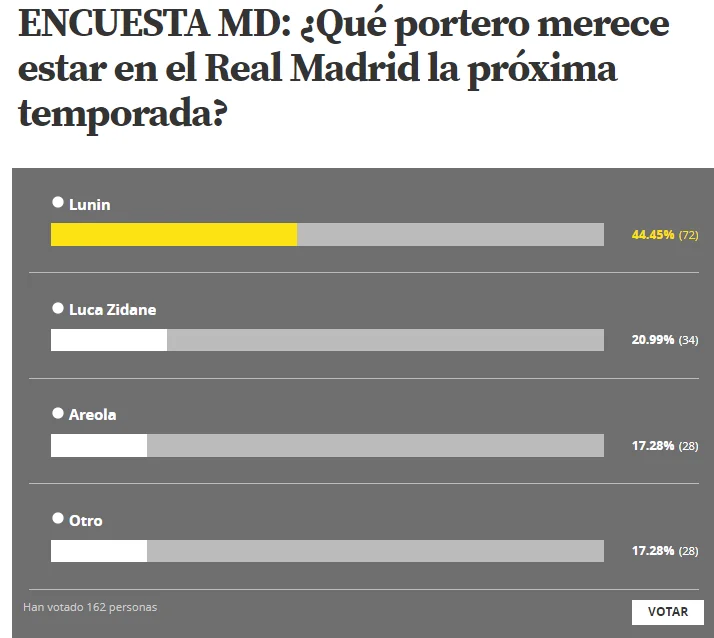 Также существует вариант, при котором Реал просто выйдет на трансферное окно, взяв дублера Куртуа "со стороны", но в любом случае мадридцам придется столкнуться с муками выбора. Mundo Deportivo решило помочь клубу, запустив голосованиt: "Какой вратарь заслуживает быть в Реале в следующем сезоне?". Андрей Лунин уверенно побеждает – за украинца проголосовало более 44% читателей