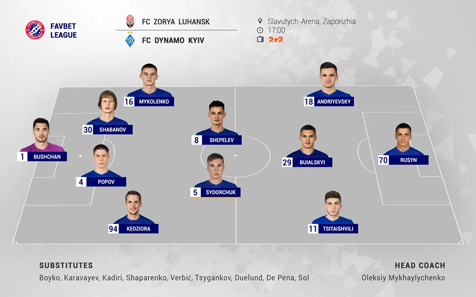 Динамо: Бущан – Кендзера, Попов, Шабанов, Миколенко – Сидорчук (к), Шепелев – Цитаишвили, Буяльский, Андриевский – Русин