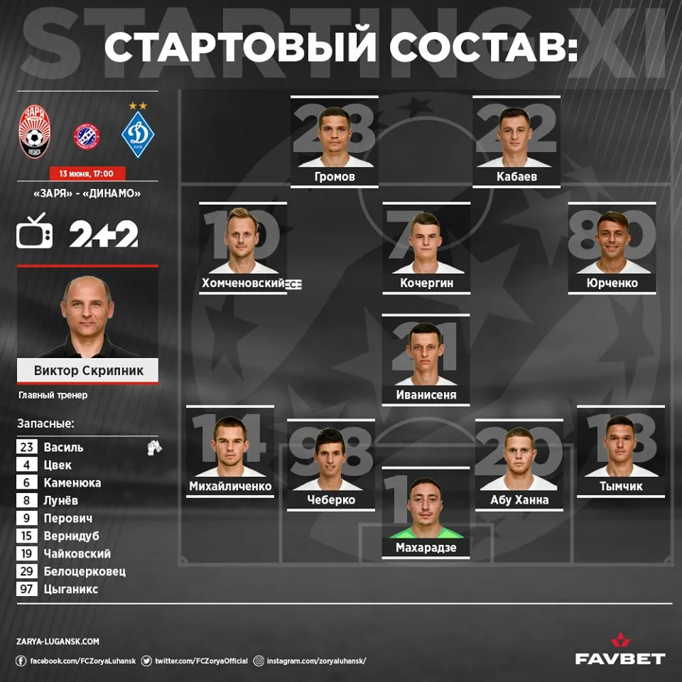 Заря: Махарадзе – Тымчик, Абу Ханна, Чеберко, Михайличенко – Иванисеня – Юрченко, Хомченовский (к), Кочергин – Кабаев, Громов