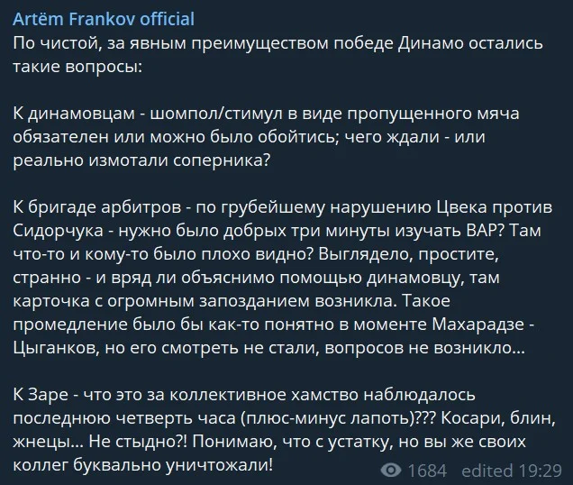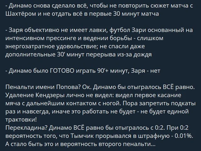 Главный редактор журнала "Футбол" Артем Франков считает, что Динамо победило при явном игровом преимуществе. А также задает вопросы всем сторонам. "Динамовцам" – почему ждали пропущенного мяча? Судьям – почему так долго изучали грубейший фол против Сидорчука? Заре – почему "косари, жнецы" уничтожали игроков Динамо?
