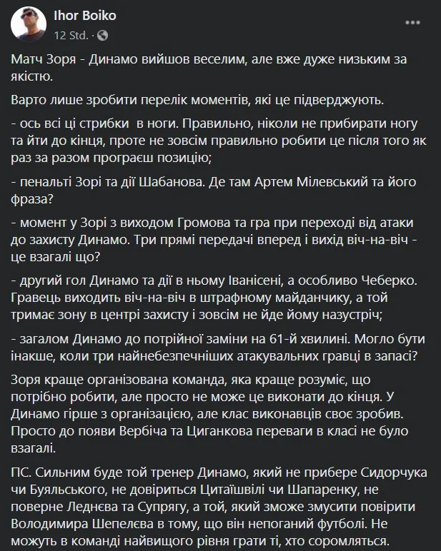 Комментатор Setanta Sports Игорь Бойко поделился мнением, которое возникло у многих. "Матч был очень низким по качеству", – пишет он, акцентируя внимание на нескольких эпизодах. "Заря лучше организованная команда, которая лучше понимает, что нужно делать, но просто не может это выполнить до конца. У Динамо хуже с организацией, но класс исполнителей свое сделал", – главный посыл комментатора.