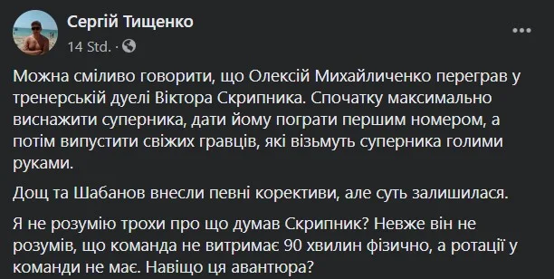 А вот блогер "Футбол 24" Сергей Тищенко утверждает, что Алексей Михайличенко переиграл в тренерской дуэли Виктора Скрипника. Первый выбрал грамотный план, а второй пошел на непонятную авантюру.