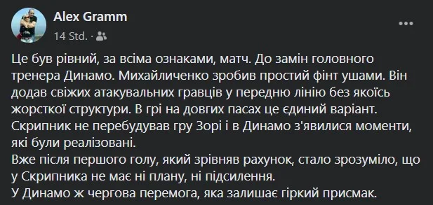 Алекс Грэмм, который пишет о футбольной тактике, выразил похожую мысль: "Михайличенко сделал простой финт ушами, а у Скрипника нет ни плана, ни усиления. У Динамо очередная победа, которая оставляет горький привкус".