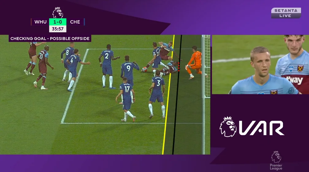 Игра раскрылась на 34-й минуте, когда после подачи с углового на дальней штанге произошло падение Антонио и Аспиликуэты. Мяч отскочил к Соучеку, сначала пробившего в Антонио, а затем протолкнувшего мяч мимо него и Сесара в ворота – впрочем, гол отменили после долгого просмотра видеоповтора, на котором нашли пассивный офсайд у нападающего "молотобойцев".