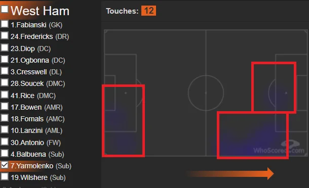 Андрей, по сравнению с поединком против Вулвз, получил аж три дополнительные минуты на поле – 16 против предыдущих 13. За этот период мало что можно было продемонстрировать, но общие показатели украинца в конце встречи держались на уровне статистики других лидеров. Ярмоленко успел сделать 12 касаний (лидер), 8 пасов (7 точных, лидер), 1 неудачный обыгрыш на дриблинге (у Уилшера и Антонио по два, но экс-динамовцу не засчитали момент с Рюдигером), 1 вынос, 1 фол, 2 потери мяча и 2 единоборства (ноль успешных). Также он запорол одну контратаку, но не отлынивал от работы в обороне.