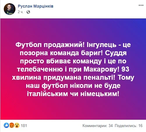 Руслан Марцинкив в своем Facebook написал гневный пост по поводу скандального поединка Ингулец – Прикарпатье.